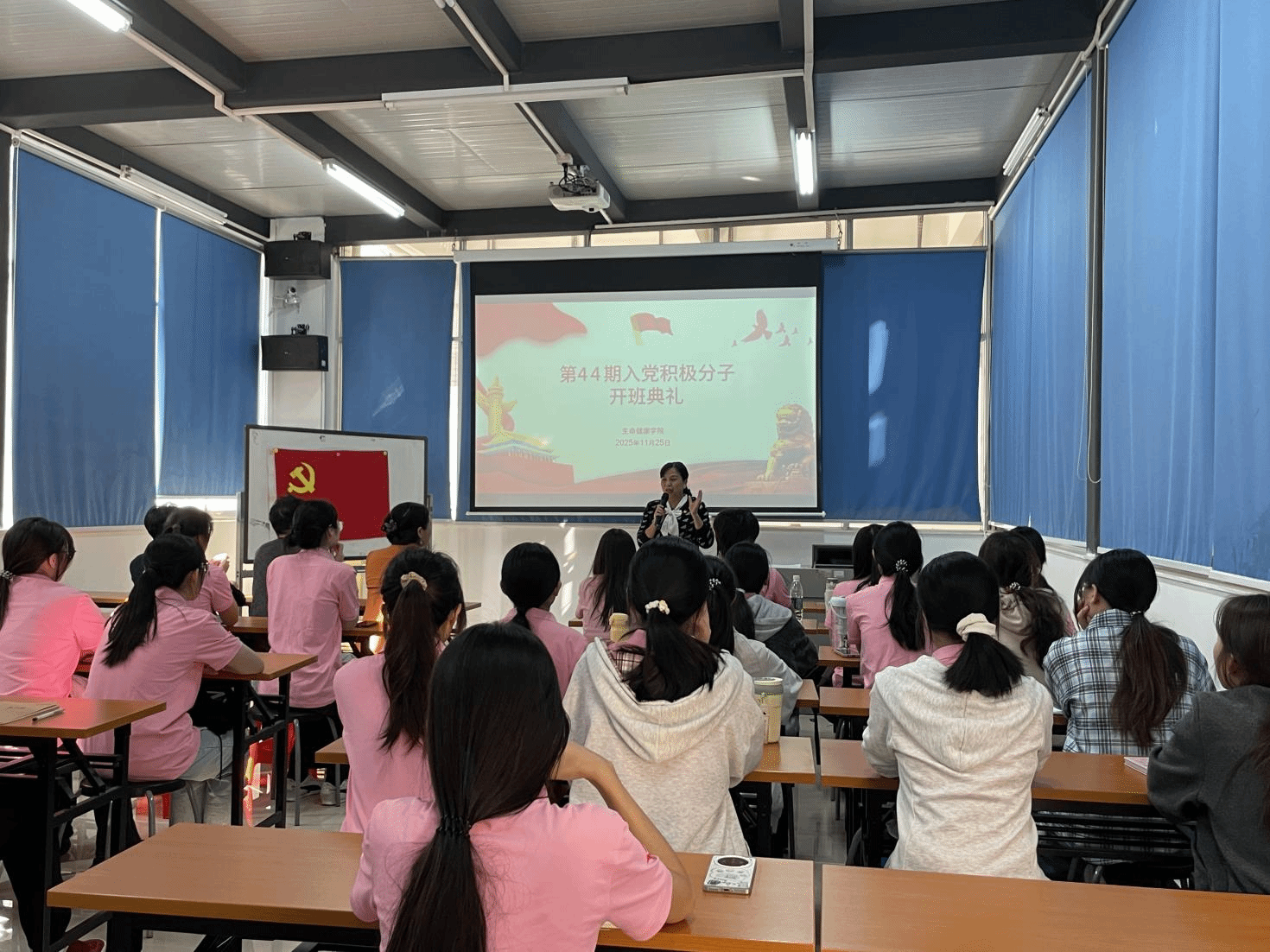 2025年11月25日下午,广东轻工职业技术大学生命健康学院第44期入党积极分子培训班开班典礼在第三实训楼C315室庄严举行。学院党总支书记周爱芳出席典礼并发表讲话,随后为全体学员讲授了专题党课。